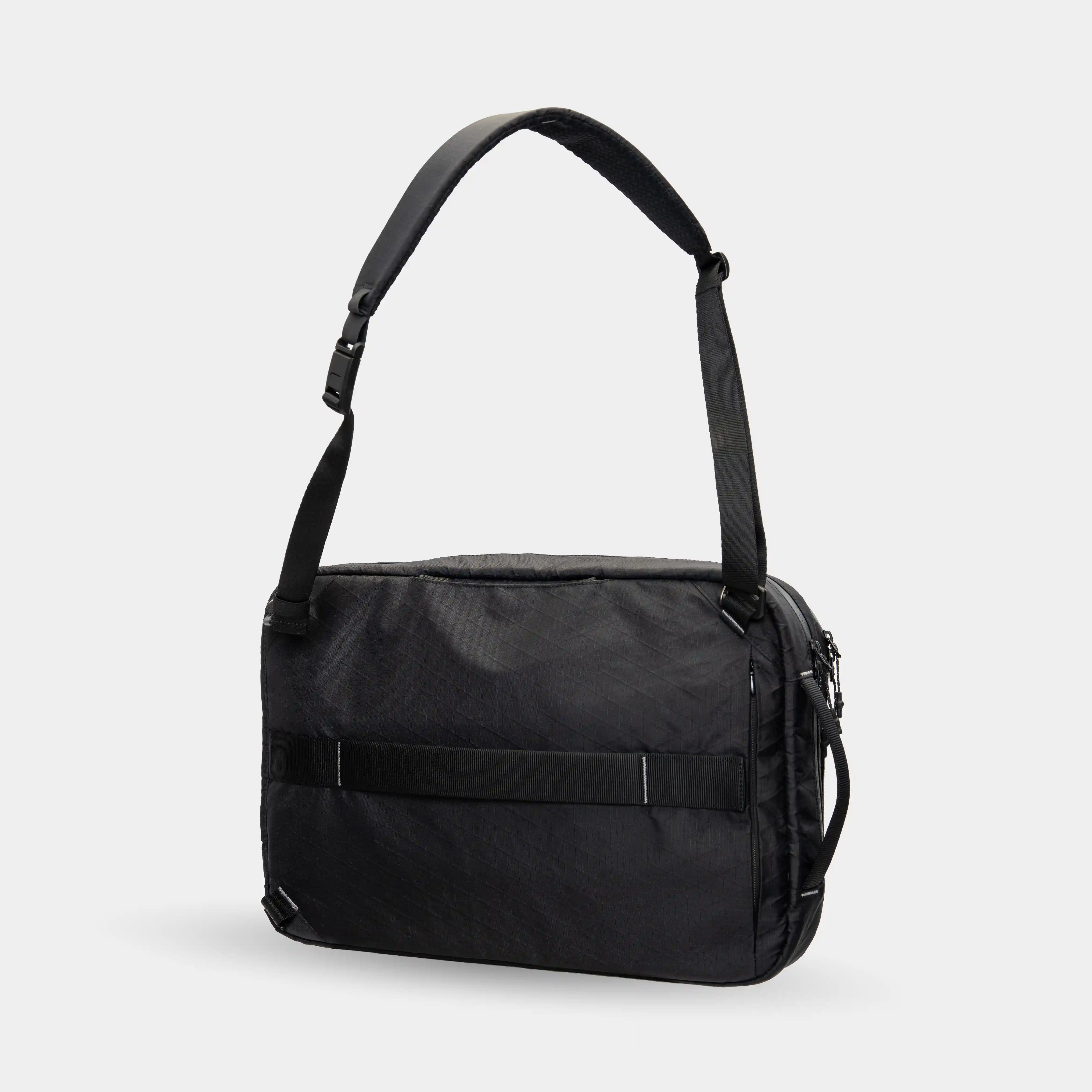 The bag features a hidden back pocket secured with a zipper, housing two interchangeable shoulder straps. Each strap is fitted with removable hooks that easily clip onto the loops at the base of the bag, allowing you to adjust and secure your carry setup for any style of transit.