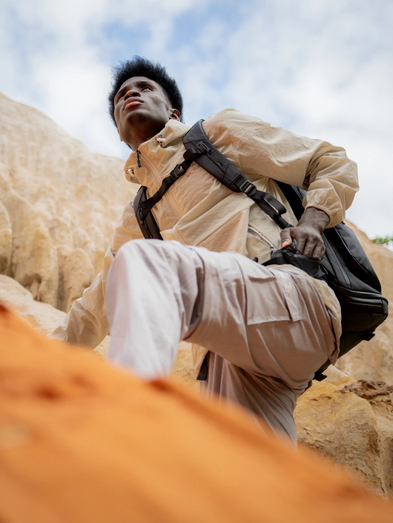 Built for movement camera backpack worn during a climb, showing secure fit and all-day comfort in rugged terrain.