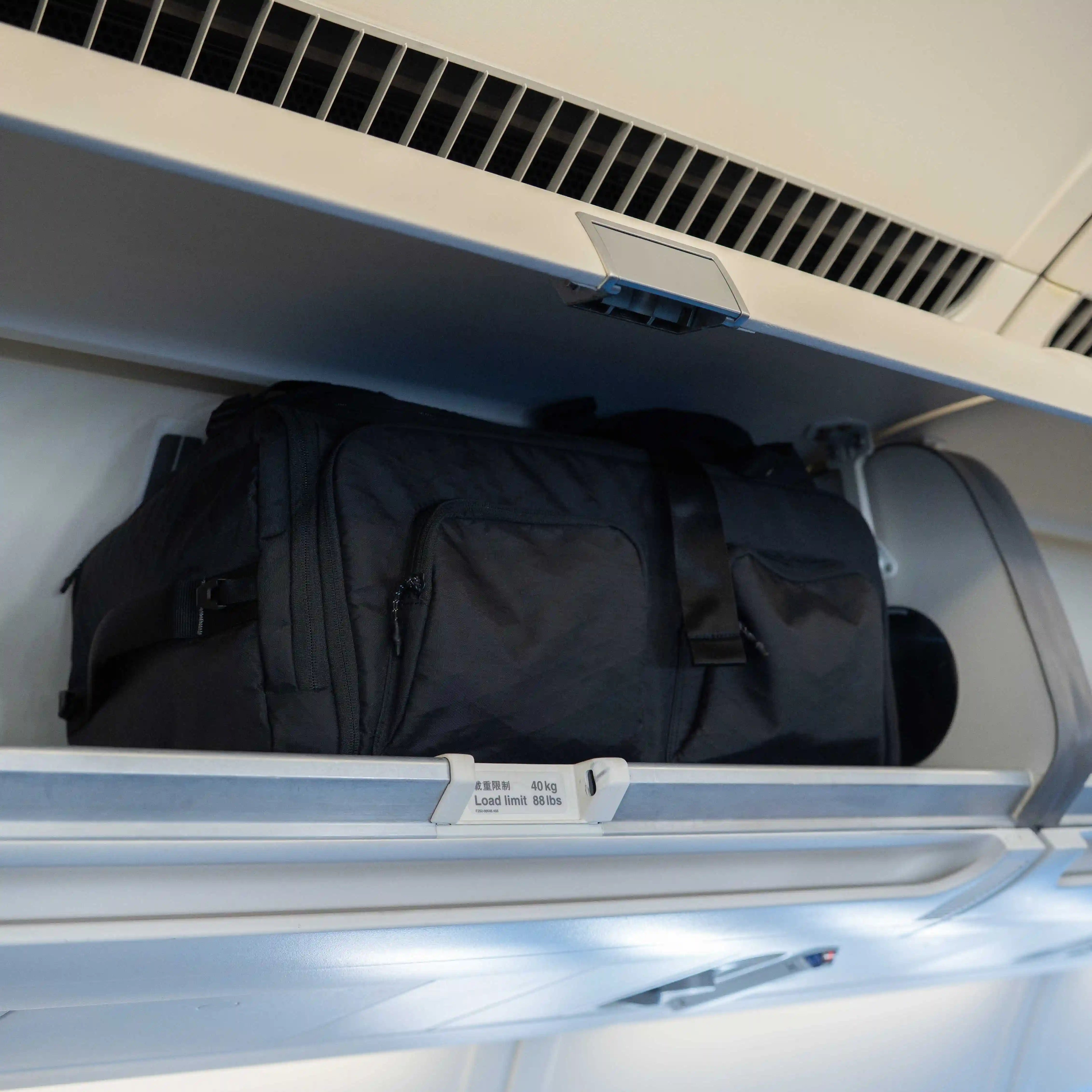 Sakk Pack V2 stored in airplane overhead cabin. Fits cinema cameras, laptop, and travel essentials.